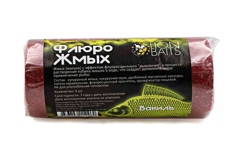 Флюро-жмых предназначен для ловли рыбы семейства карповых. Макуха изготовлена в виде прессованных шайб диаметром 47-48 мм, состоящих из злаковых и масличных культур с добавлением флуоресцентного красителя, который при растворении создает привлекающую дымку. В процессе распада шайбы, из нее выделяются частицы флуоресцентной краски, смешиваясь с водой, она создает эффект мути, что является дополнительным привлечением для карпов.