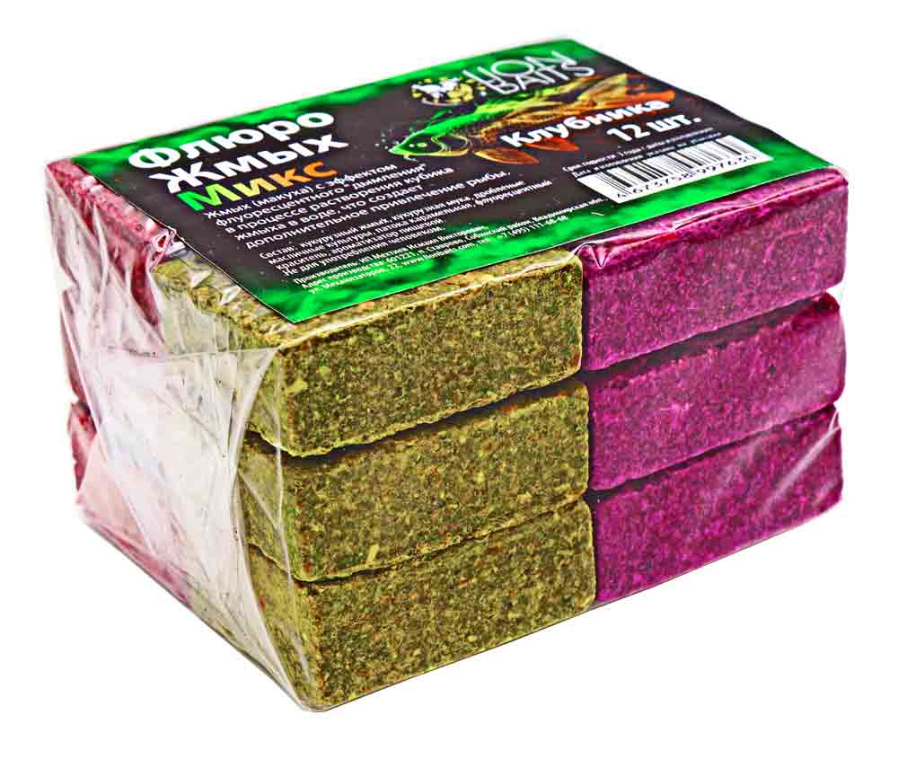 Флюро-жмых микс предназначен для ловли рыбы семейства карповых. Макуха изготовлена в виде прессованных брусочков четырех цветов в одной упаковке (по 3шт - желтый, красный, розовый, зеленый), состоящих из злаковых и масличных культур с добавлением флуоресцентного (UV) красителя, который при растворении создает привлекающую дымку. В процессе распада кубика, из него выделяются частицы флуоресцентной краски, смешиваясь с водой она создает эффект мути, что является дополнительным привлечением для карпов. Внимание: краситель не создает свечения в воде!
