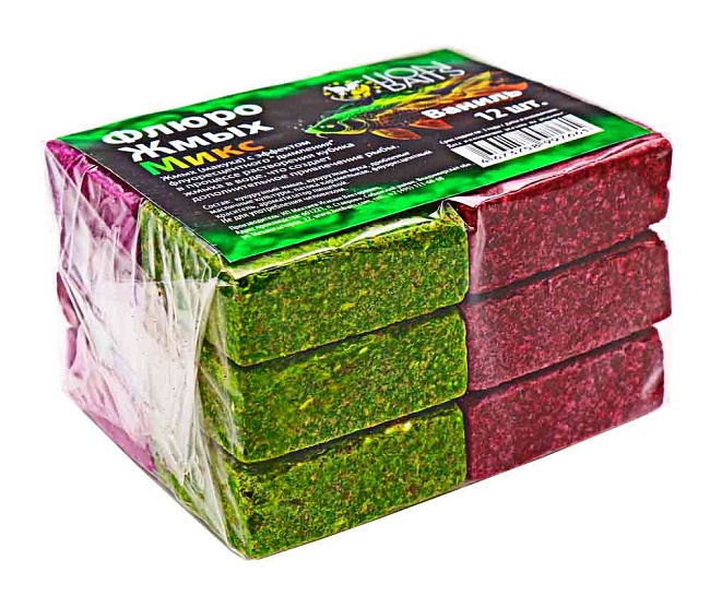 Флюро-жмых микс предназначен для ловли рыбы семейства карповых. Макуха изготовлена в виде прессованных брусочков четырех цветов в одной упаковке (по 3шт - желтый, красный, розовый, зеленый), состоящих из злаковых и масличных культур с добавлением флуоресцентного (UV) красителя, который при растворении создает привлекающую дымку. В процессе распада кубика, из него выделяются частицы флуоресцентной краски, смешиваясь с водой она создает эффект мути, что является дополнительным привлечением для карпов. Внимание: краситель не создает свечения в воде!