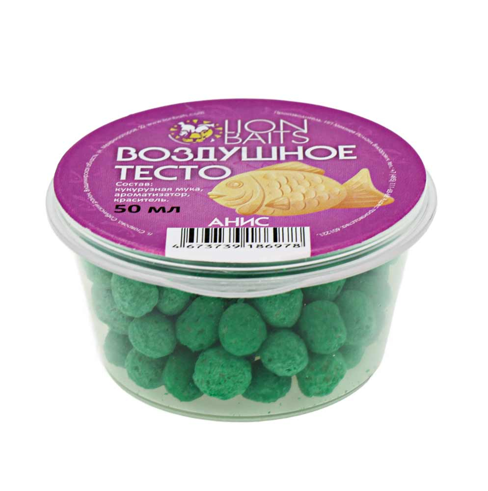Воздушное тесто анис – это плавающая насадка в виде шариков из кукурузного теста правильной формы, размером 5-7 мм с пористой и мягкой структурой. Плавающая насадка легко нанизывается на крючок и от 20 до 40 минут удерживается на нем, соблазняя на поклевку карасей, карпов, лещей, язей и других рыб. Насаживать шарики воздушного теста можно двумя способами: