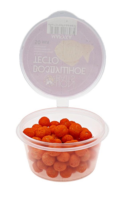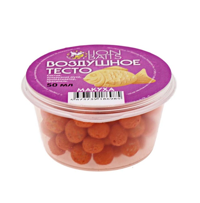 Воздушное тесто макуха – это плавающая насадка в виде шариков из кукурузного теста правильной формы, размером 5-7 мм с пористой и мягкой структурой. Плавающая насадка легко нанизывается на крючок и от 20 до 40 минут удерживается на нем, соблазняя на поклевку карасей, карпов, лещей, язей и других рыб. Насаживать шарики воздушного теста можно двумя способами: