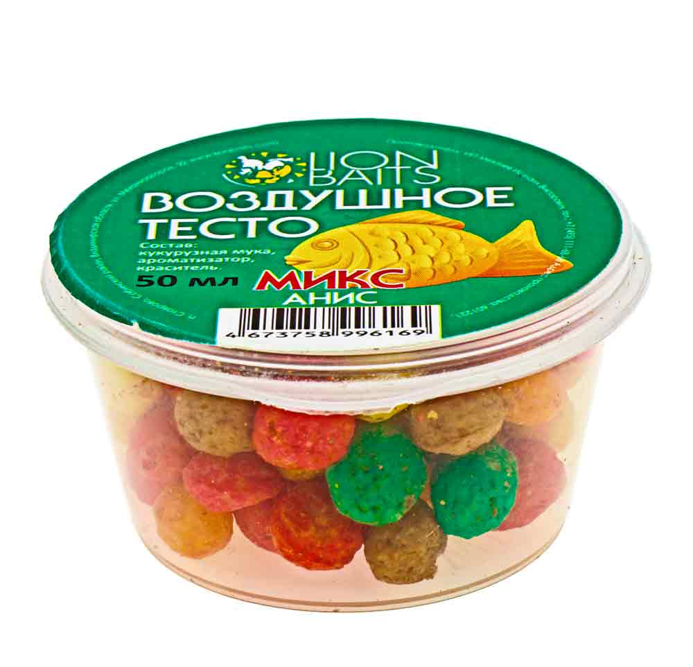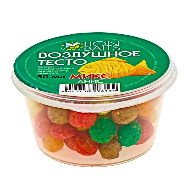 Воздушное тесто (цветной микс) анис – это плавающая насадка в виде шариков из кукурузного теста правильной формы, размером 5-7 мм с пористой и мягкой структурой. Плавающая насадка легко нанизывается на крючок и от 20 до 40 минут удерживается на нем, соблазняя на поклевку карасей, карпов, лещей, язей и других рыб. Насаживать шарики воздушного теста можно двумя способами: