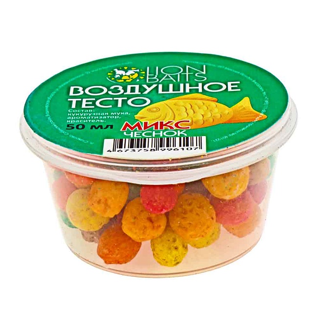 Воздушное тесто (цветной микс) чеснок – это плавающая насадка в виде шариков из кукурузного теста правильной формы, размером 5-7 мм с пористой и мягкой структурой. Плавающая насадка легко нанизывается на крючок и от 20 до 40 минут удерживается на нем, соблазняя на поклевку карасей, карпов, лещей, язей и других рыб. Насаживать шарики воздушного теста можно двумя способами: