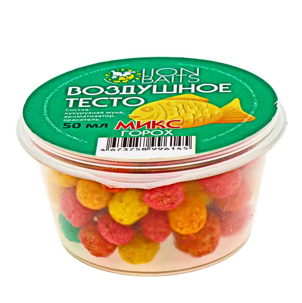 Воздушное тесто (цветной микс) горох – это плавающая насадка в виде шариков из кукурузного теста правильной формы, размером 5-7 мм с пористой и мягкой структурой. Плавающая насадка легко нанизывается на крючок и от 20 до 40 минут удерживается на нем, соблазняя на поклевку карасей, карпов, лещей, язей и других рыб. Насаживать шарики воздушного теста можно двумя способами: