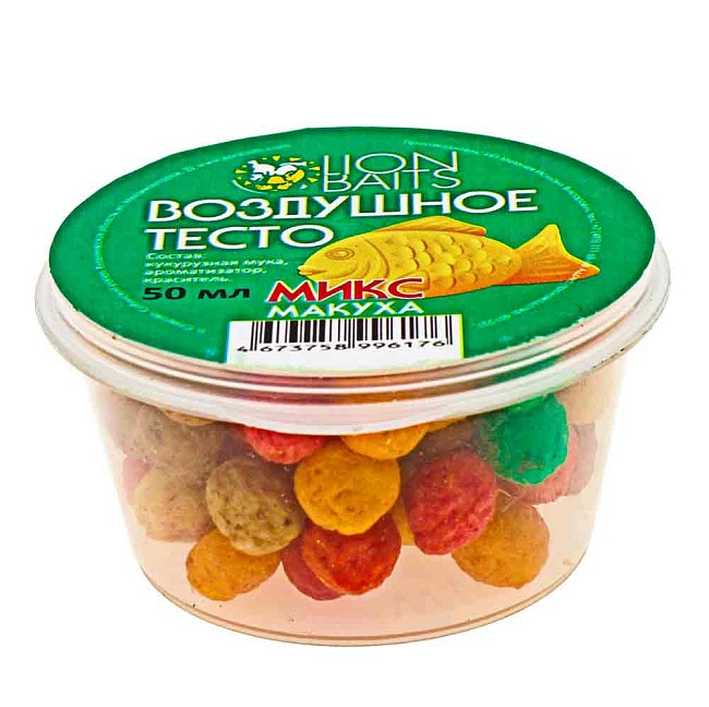 Воздушное тесто (цветной микс) макуха – это плавающая насадка в виде шариков из кукурузного теста правильной формы, размером 5-7 мм с пористой и мягкой структурой. Плавающая насадка легко нанизывается на крючок и от 20 до 40 минут удерживается на нем, соблазняя на поклевку карасей, карпов, лещей, язей и других рыб. Насаживать шарики воздушного теста можно двумя способами: