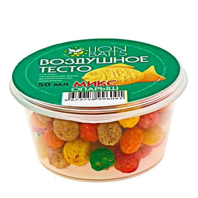 Воздушное тесто (цветной микс) опарыш – это плавающая насадка в виде шариков из кукурузного теста правильной формы, размером 5-7 мм с пористой и мягкой структурой. Плавающая насадка легко нанизывается на крючок и от 20 до 40 минут удерживается на нем, соблазняя на поклевку карасей, карпов, лещей, язей и других рыб. Насаживать шарики воздушного теста можно двумя способами: